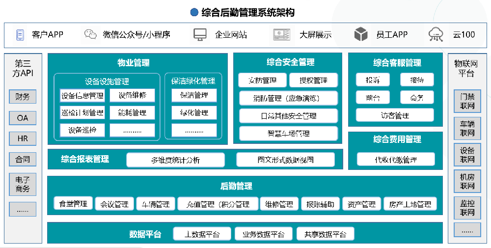 综合后勤管理系统:将食堂管理、物业管理、房产管理、安防管理、车辆管理、设备管理等模块融合到统一平台上,实现省、地市公司的信息共享与传递,实现精准化管理、降本增效的管理理念。