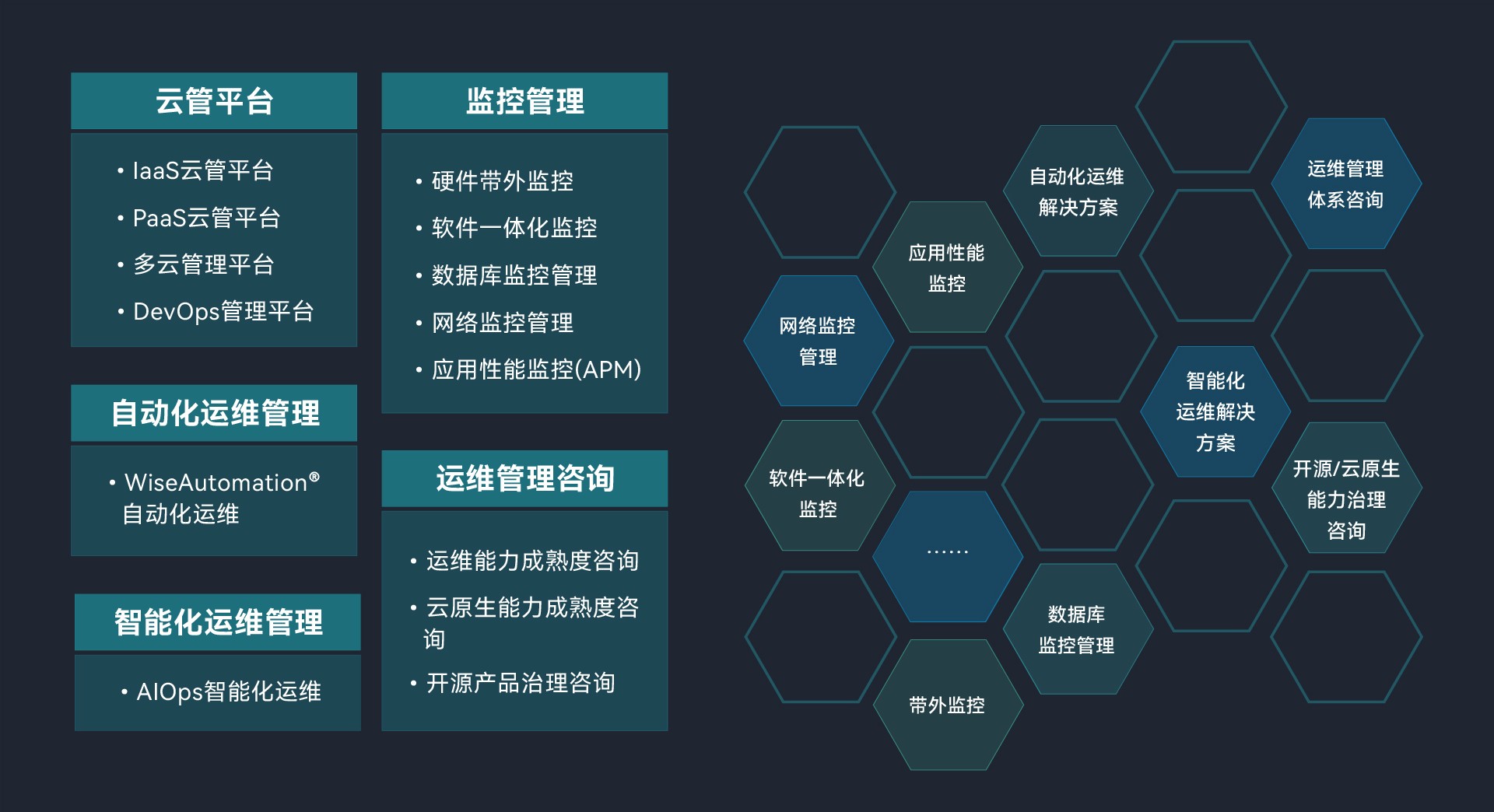 乐鱼官方网站-乐鱼leyu(中国) 在运维管理产品领域提供硬件、软件监控、自动化运维、智能化运维和安全管理等产品解决方案,帮助客户实现对基础设施、应用程序和服务的全方位监控、反馈和管理。同时,乐鱼官方网站-乐鱼leyu(中国) 在运维支撑平台领域提供云、大数据和智能平台中台解决方案,为客户打造基础设施管理平台,确保客户在各类运维需求下,都能够得到充分的支撑和保障。